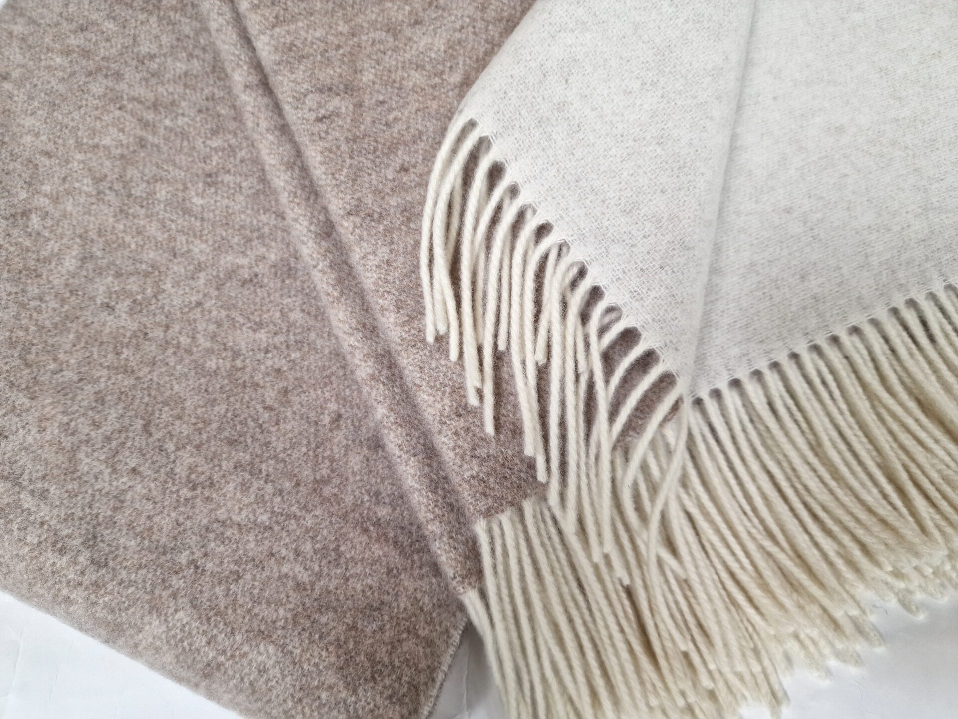 von Merinowolle mit Kaschmir (das Plaid ist hergestellt aus 90% hochqualitativer weicher Merinowolle mit einem Zusatz von 10% Kaschmir). Ungeachtet dessen, dass das Plaid nicht dick ist, hält es