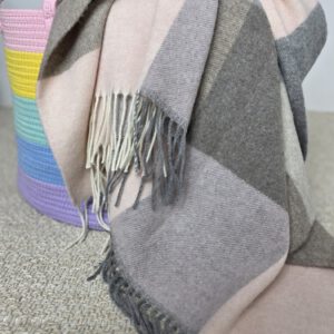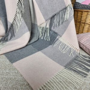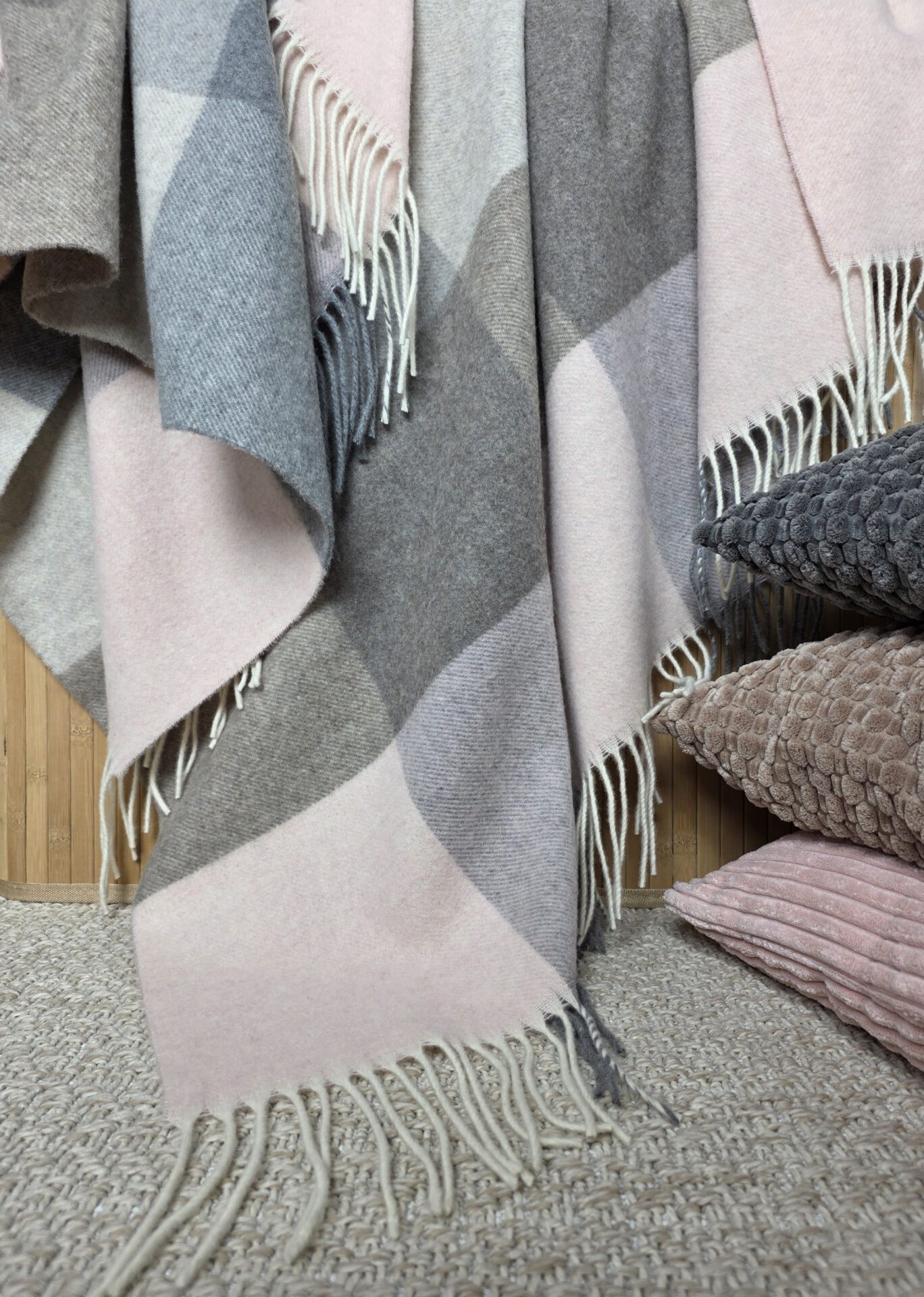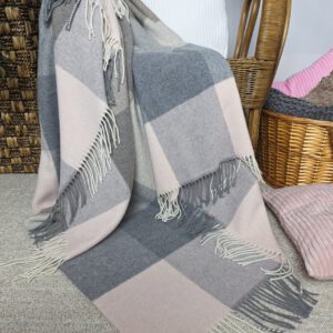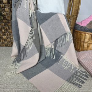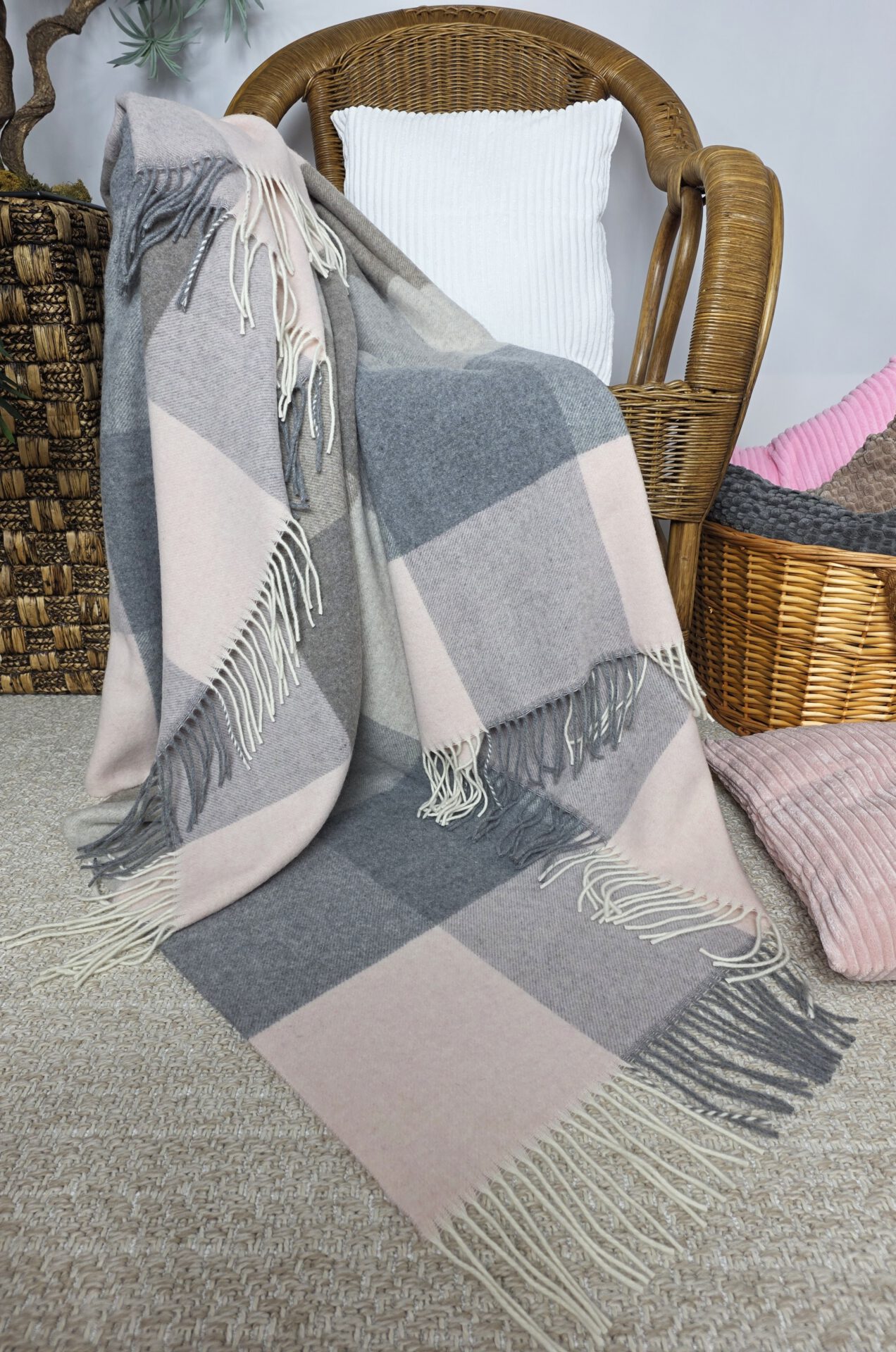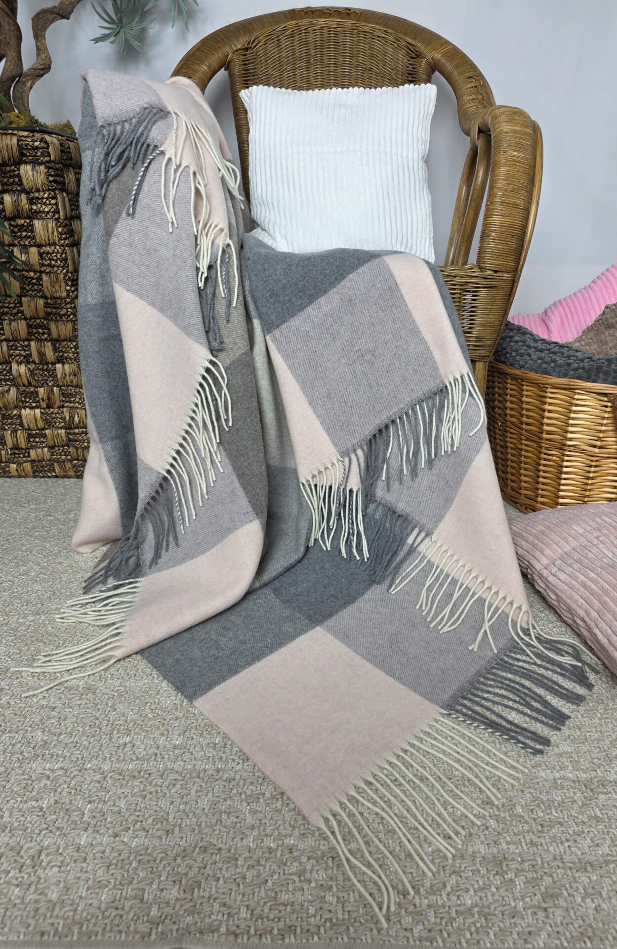 Wolldecke & Wollplaid, 90 % Merinowolle,10% Kaschmir „Faro Karo“ grau-braun-rosa